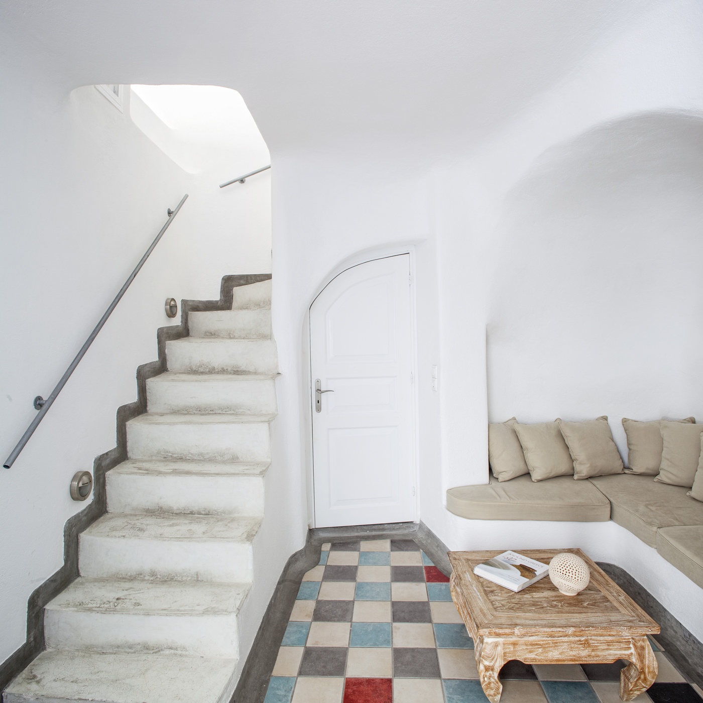 The whole complex is situated in Firostefani, at the most central part of the Caldera cliff. It is comprised of 4 Suites, 3 of which are cave houses. The Suites have circular ends and curves. All Suites are spacious and tastefully decorated in order to make your stay here unforgettable. They all have fully equipped kitchens and magnificent en-Suite bathrooms with Jacuzzi in blue, green and orange shades.